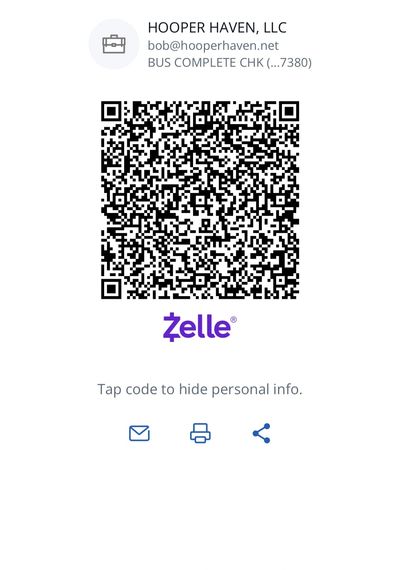 Hooper Haven, LLC accepts Zelle and Venmo.  Of course, cash or check when you see us.  Please use the QR code to make payments for your Leagues, Tournaments, Shirts, etc.